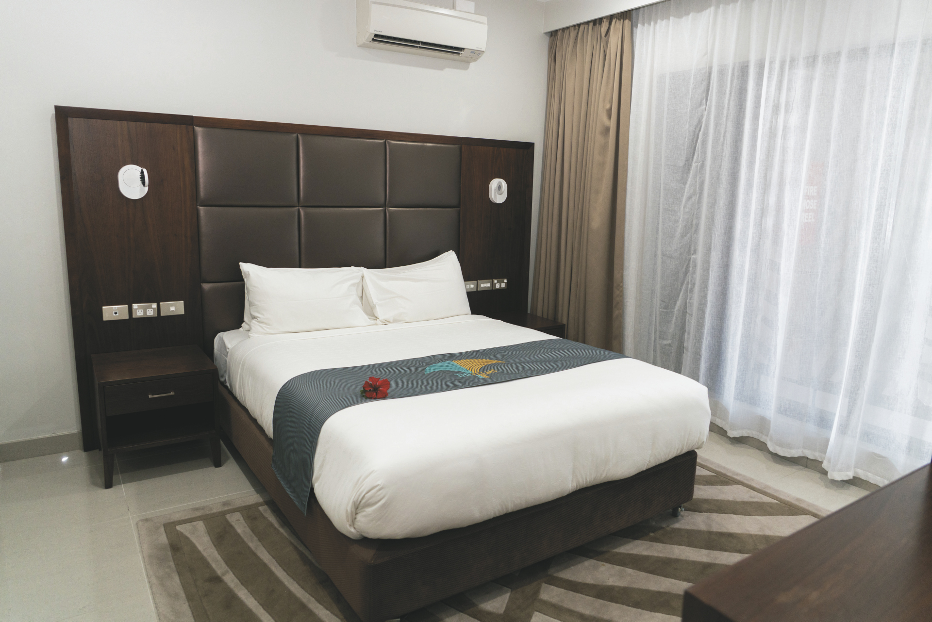 Apartmentanlage mit Café, Swimmingpool, Fitnessraum, Tour-Desk und freundlichem Service, umgeben von einem tropischen Garten.