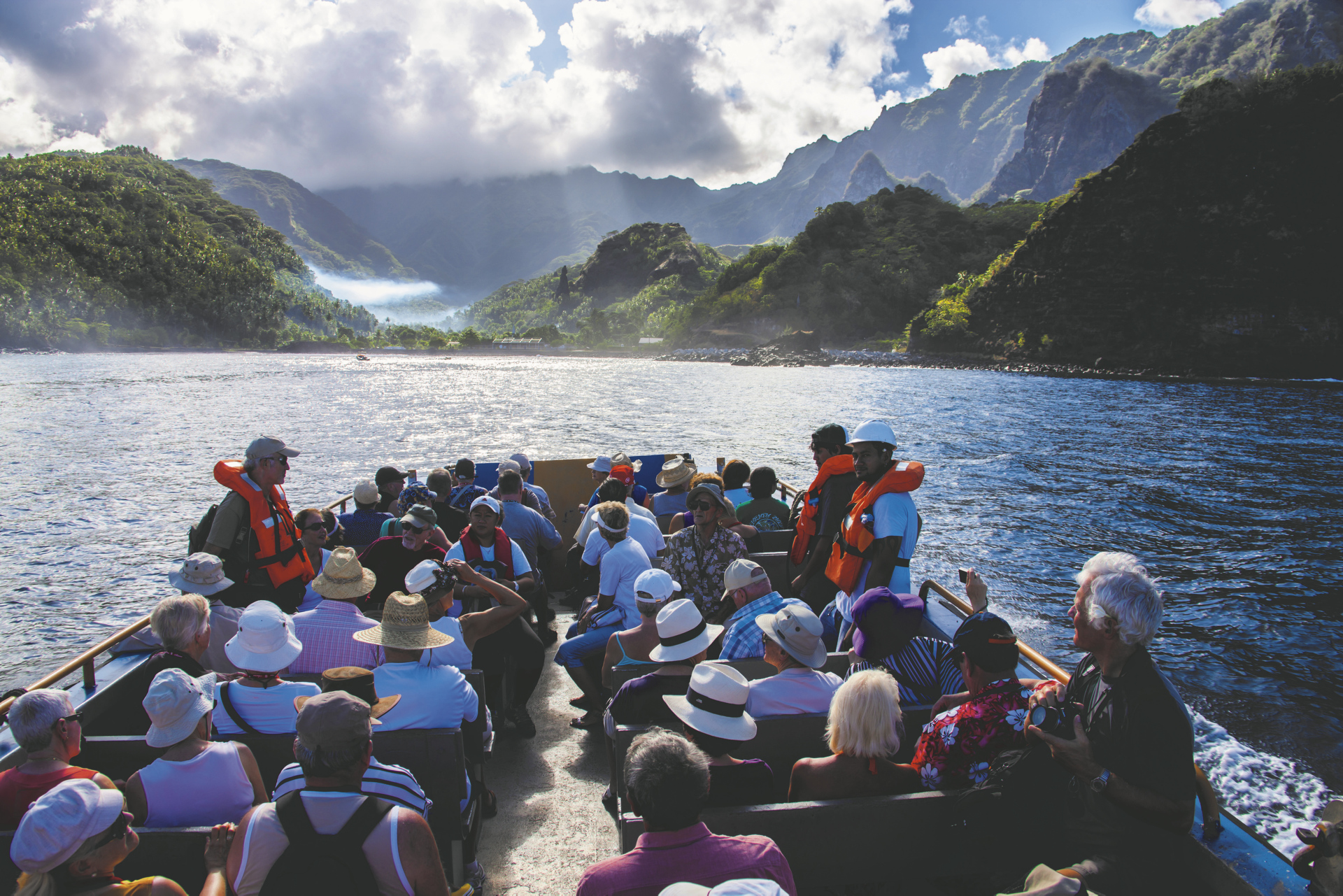 Insel Ua Huka F/M/A).Früh am Morgen wird die Aranui eine Punktdrehung in der berühmten „Baie Invisible” von Vaipaee vollführen, die aufgrund des Platzmangels das ganze Fingerspitzengefühl des Kapitäns und der Crew erfordert. Dieses Spektakel sollten Sie auf keinen Fall verpassen! Fahren Sie anschließend mit dem Allradfahrzeug nach Hane. Entdecken Sie auf dem Weg den Botanischen Garten, das Kulturzentrum Te Tumu mit seinem kleinen Museum voller hervorragender Replikate marquesischer Kunstgegenstände sowie das Petroglyphen-Museum und die Werkstätten der Holzschnitzer im Fischerdorf Hokatu. Halten Sie Ausschau nach den kunstvoll geschnitzten schwarz-weißen Kokosnüssen. In Hane besuchen sie das Meeresmuseum und es wird ein marquesisches Mittagessen serviert. Nachmittags ist eine Wanderung möglich, auf der Sie Tikis aus rotem Tuffstein entdecken werden.
