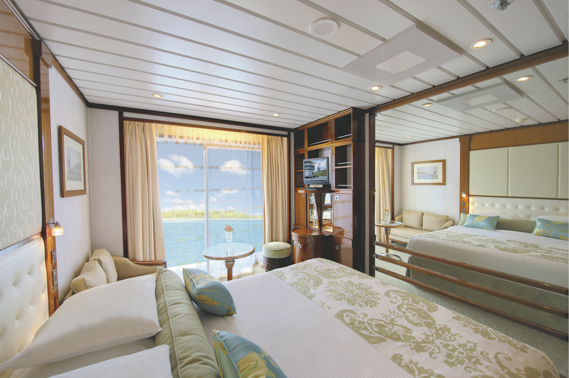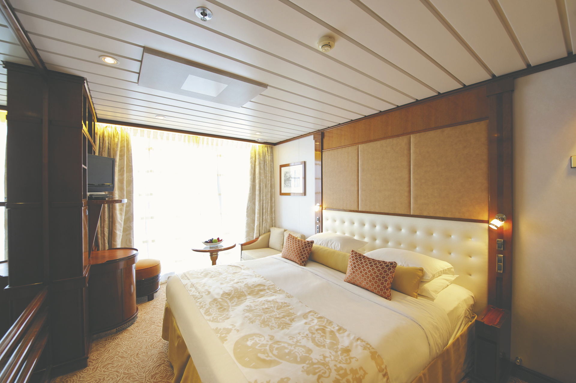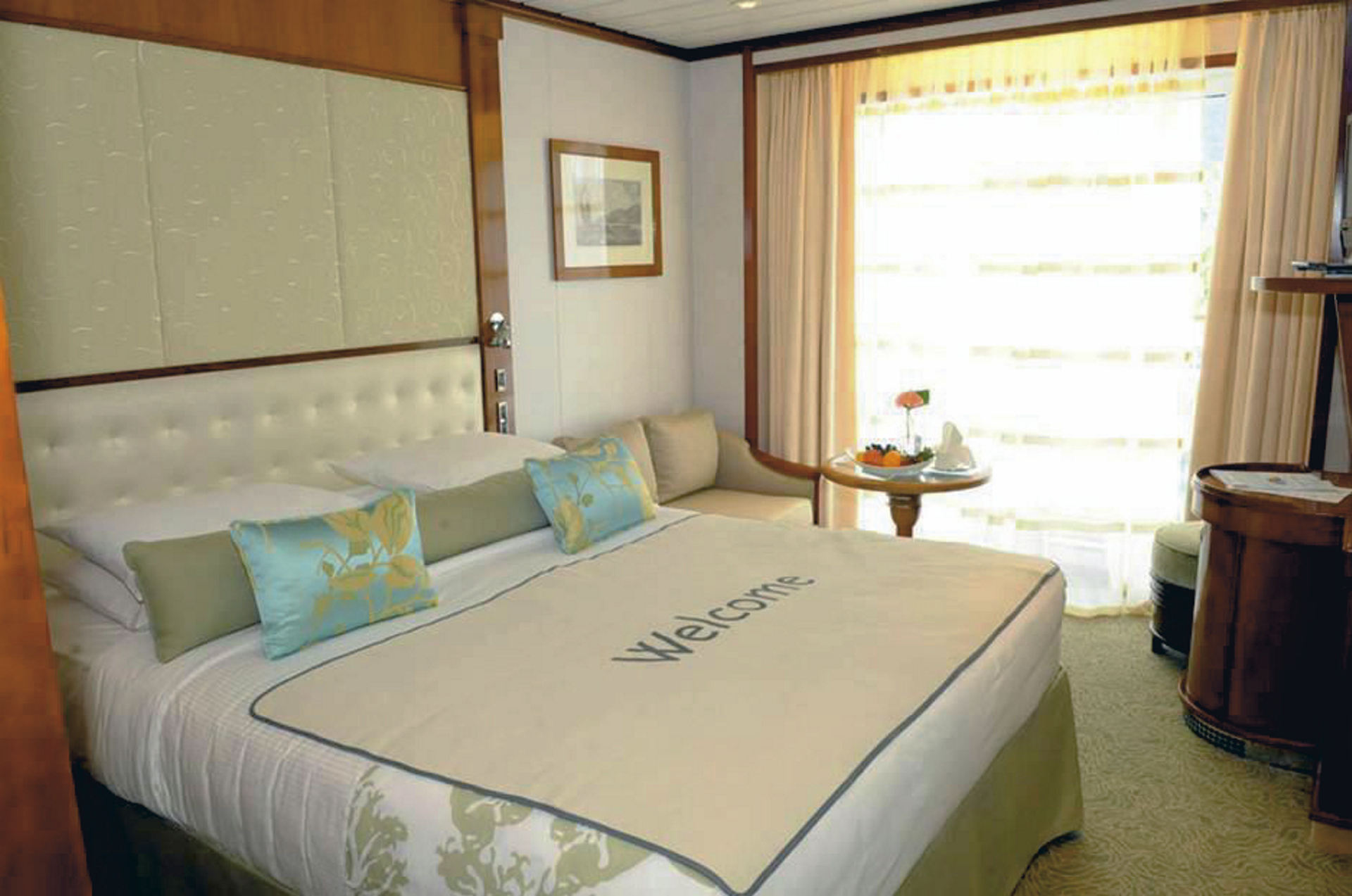 Alle Kabinen verfügen über Klimaanlage, TV, CD/DVD, Safe, Minibar (täglich gefüllt mit Soft Drinks, Bier und Wasser), Queensize-Bett (wenige Kabinen mit 2 Betten), großzügige Badezimmer mit Badewanne (wenige Kabinen nur mit Dusche), erlesene Toilettenartikel, Bademantel, Slipper, Fön. Kabinen Kat. B und höher mit Butlerservice. Kategorien: F mit Bullaugen, E mit Fenster, C & D mit Balkon, B Veranda Stateroom, A Veranda Suite, GS Grand Suite und OS Owner Suite mit großer Veranda (Preise auf Anfrage).