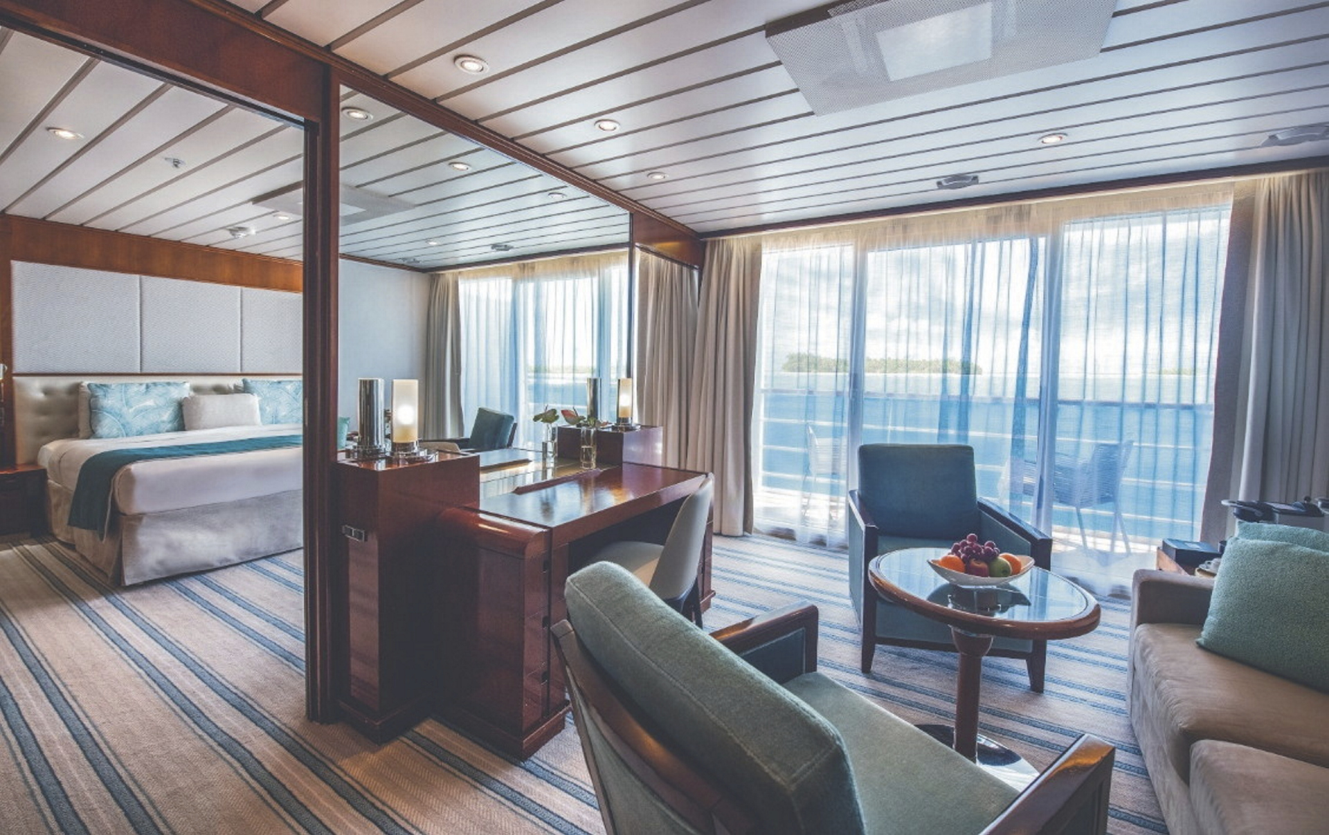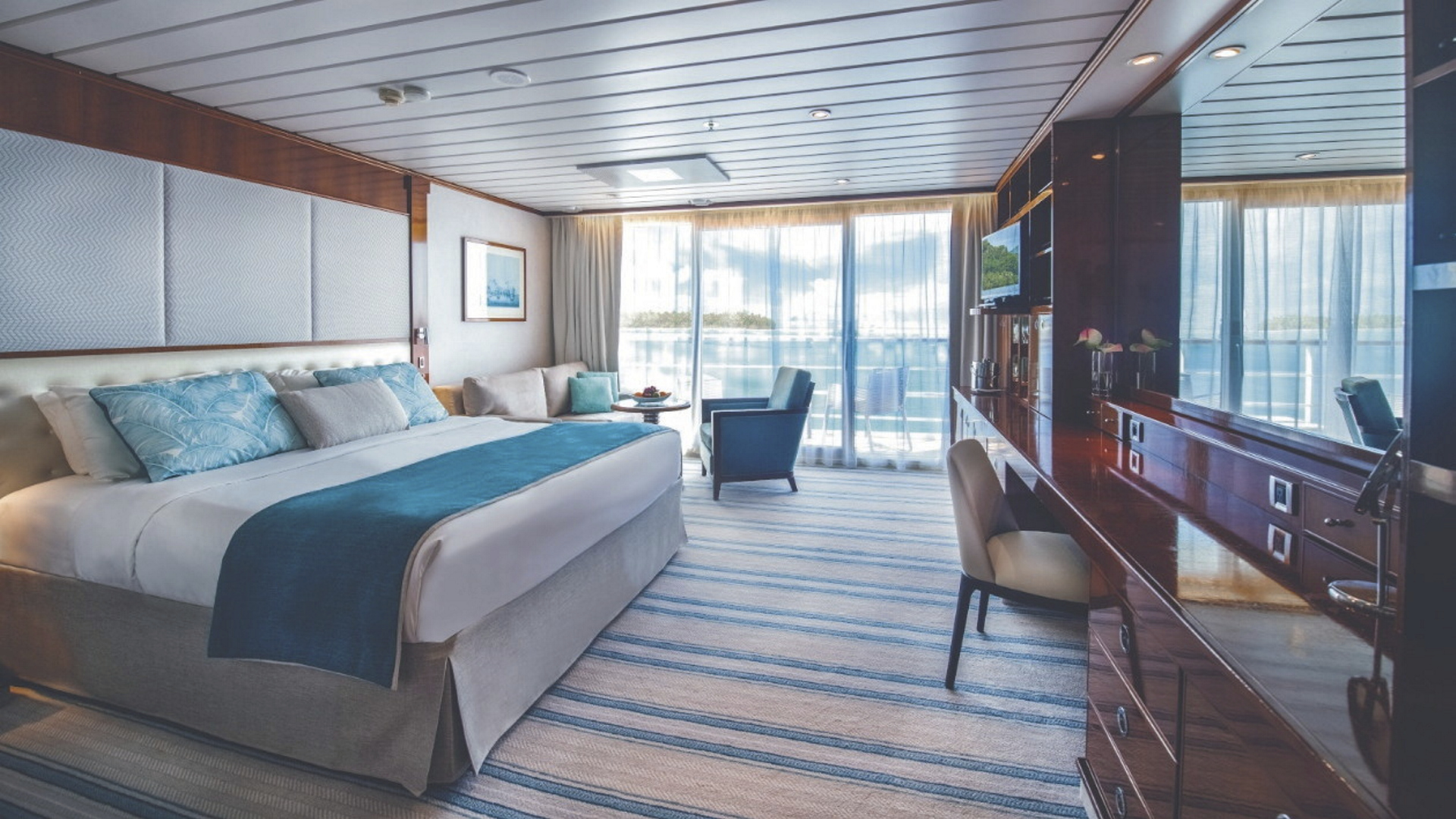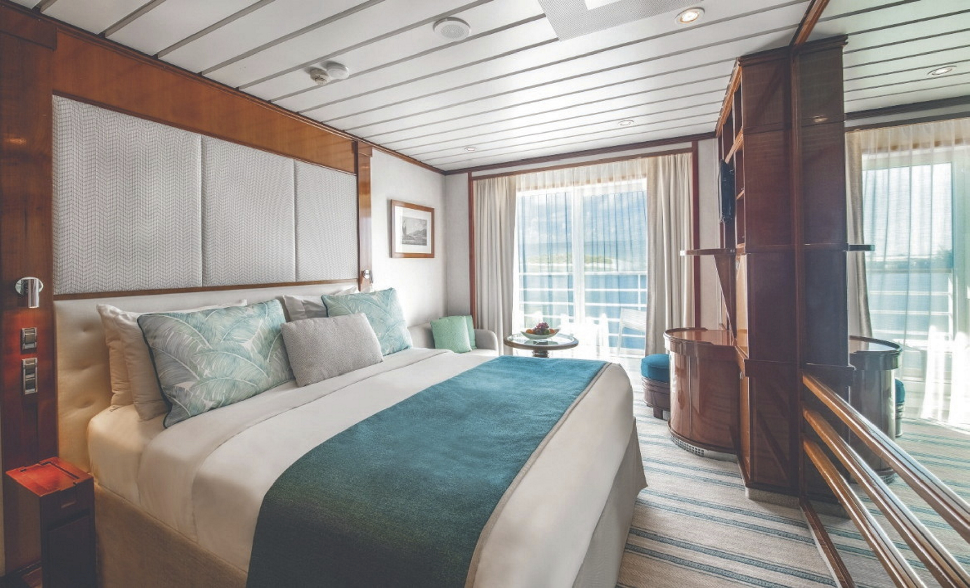 Alle Kabinen verfügen über Klimaanlage, TV, CD/DVD, Safe, Minibar (täglich gefüllt mit Soft Drinks, Bier und Wasser), Queensize-Bett (wenige Kabinen mit 2 Betten), großzügige Badezimmer mit Badewanne (wenige Kabinen nur mit Dusche), erlesene Toilettenartikel, Bademantel, Slipper, Fön. Kabinen Kat. B und höher mit Butlerservice. Kategorien: F mit Bullaugen, E mit Fenster, C & D mit Balkon, B Veranda Stateroom, A Veranda Suite, GS Grand Suite und OS Owner Suite mit großer Veranda (Preise auf Anfrage).