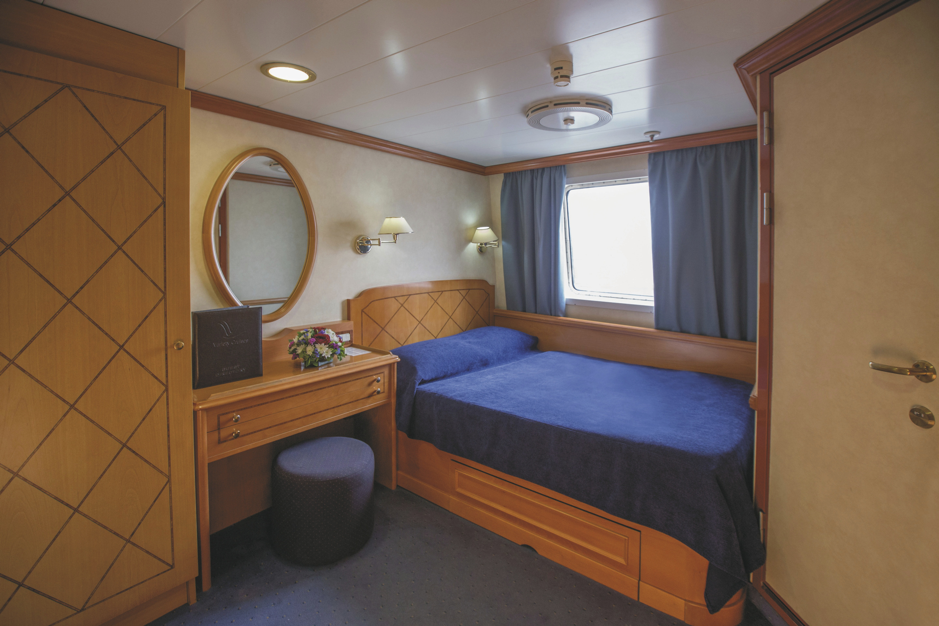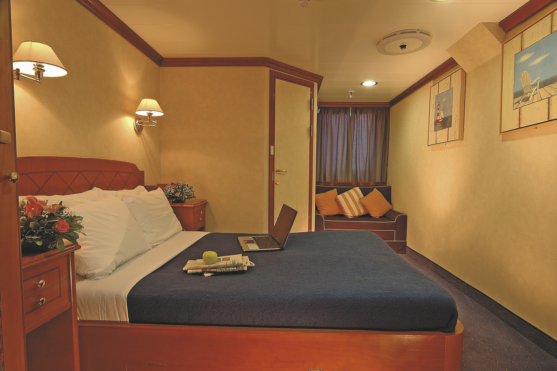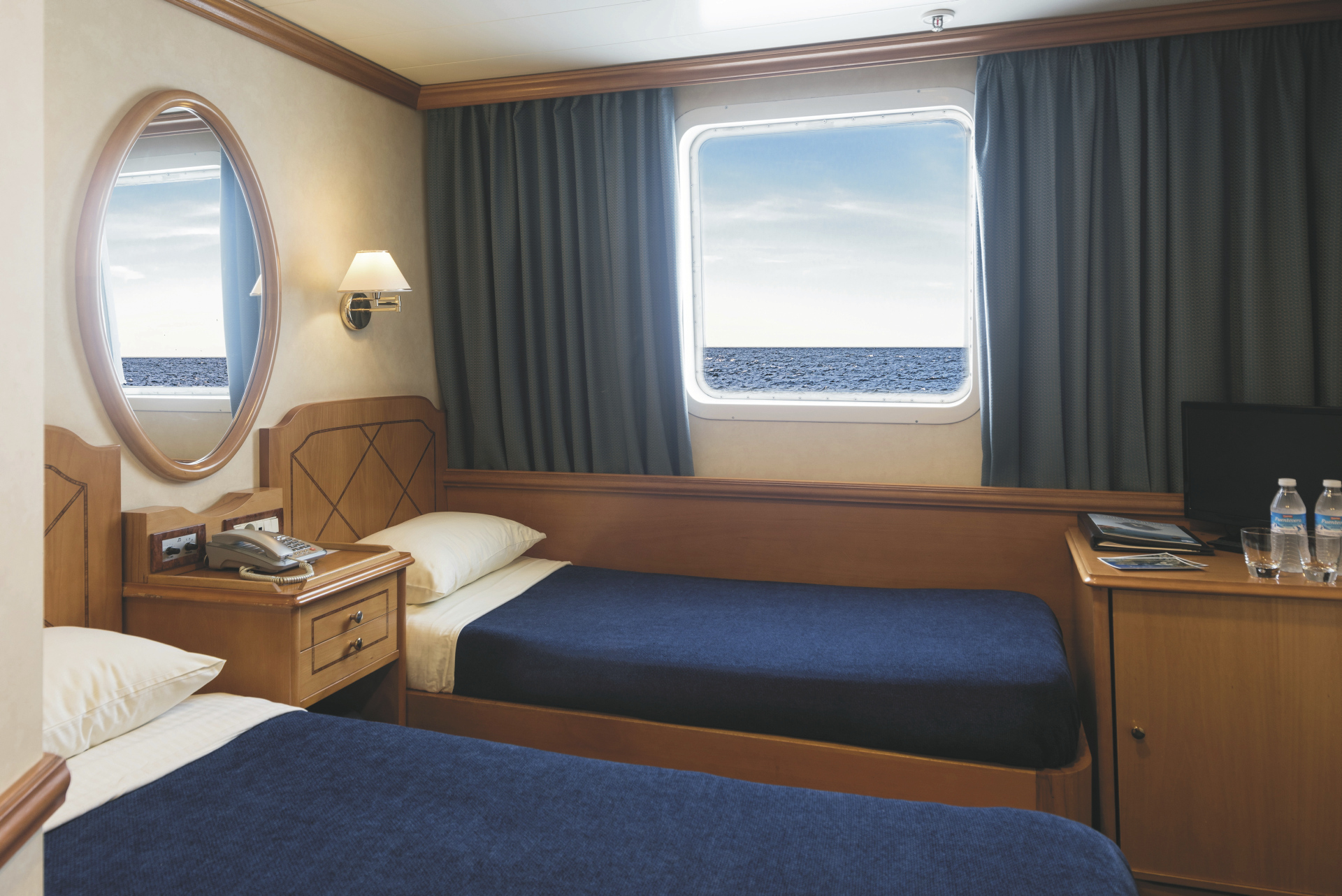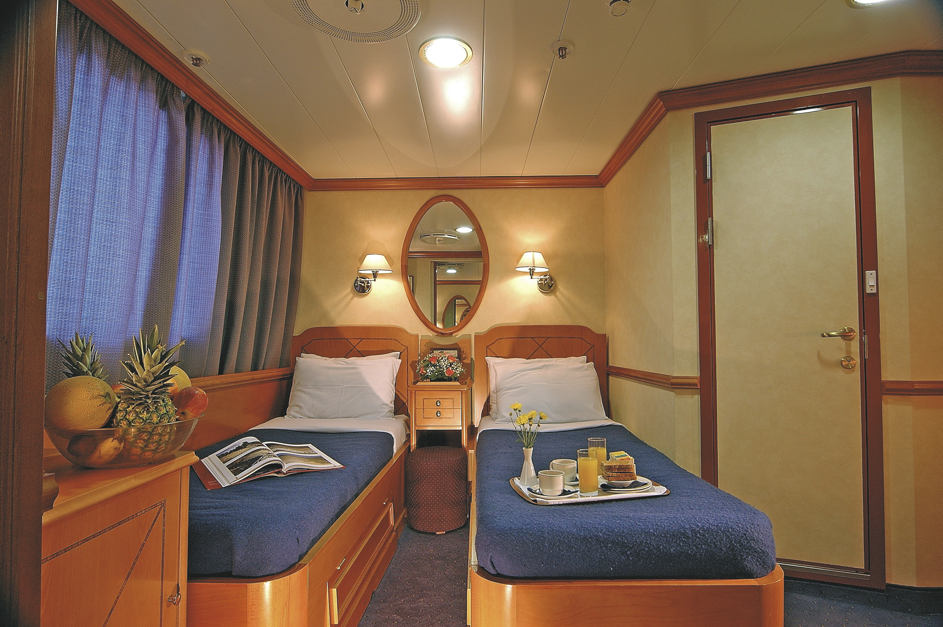 Alle Kabinen verfügen über Klimaanlage, TV, Safe, Queensize-Bett (einige mit 2 Betten), Badezimmer mit Dusche, Toilettenvartikel, Fön. Kabinen Kat. B + C mit Bullauge im Unterdeck, Kategorien: A mit Fenster entweder auf dem Ober- oder Mitteldeck.