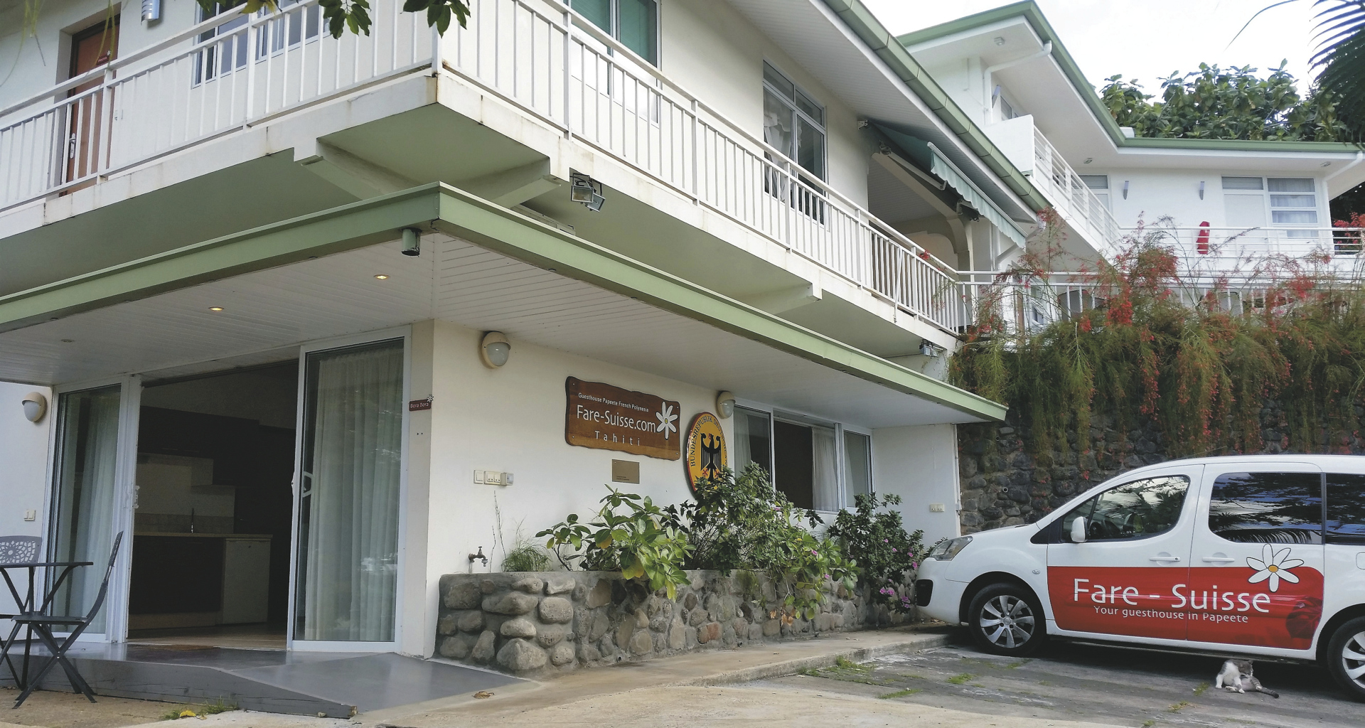 Die Pension Fare Suisse wird von Beni und Therese geleitet. Beni steht gerne mit Rat und Tat zur Seite wenn es darum geht Interessantes über Tahiti und seine Leute und Inseln zu erfahren.Auf der ruhigen Terasse kann man frühstücken oder einfach nur die Aussicht auf den schönen Garten genießen. Es gibt eine Gemeinschaftsküche und eine Bar. WLAN ist kostenlos.
