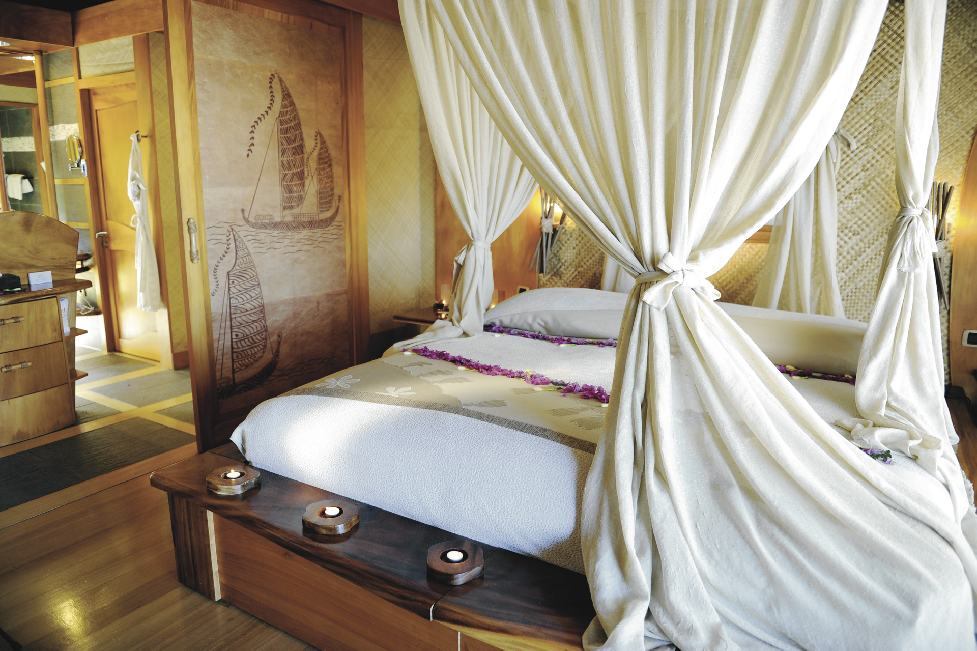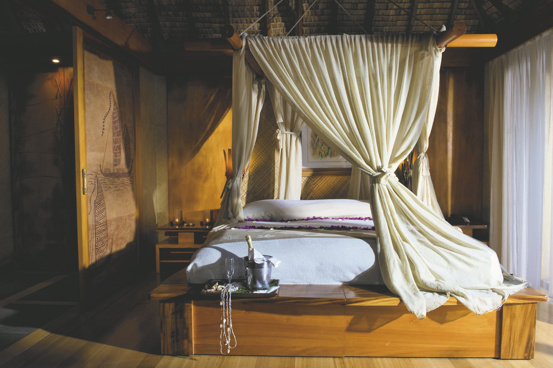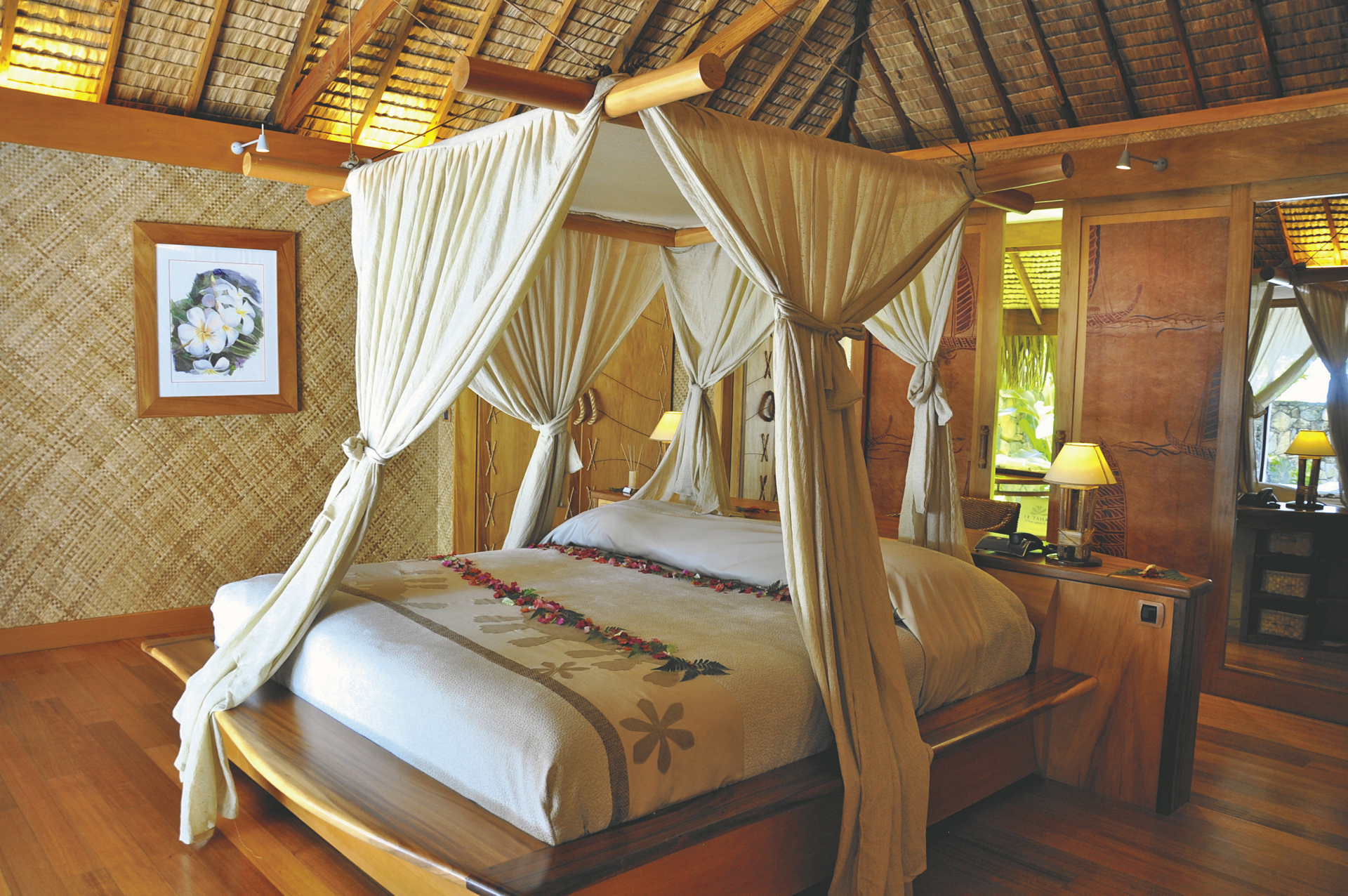 58 großzügige Villen und Suiten polynesisch schlicht und schön ausgestattet am Strand oder über der blauen Lagune mit Lounge, Terrasse, Klimaanlage, Ventilator, TV/DVD, Telefon, kleinem Kühlschrank, Tee-/Kaffeezubereiter und Safe sowie Bad mit Dusche, Badewanne und Fön stehen den Gästen zur Verfügung. Die Strandvillen sind sehr geräumig und verfügen über Garten mit privatem Pool. Die Overwater-Suiten bieten einen tollen Blick, Zugang zur Lagune und einen Glasbodentisch.