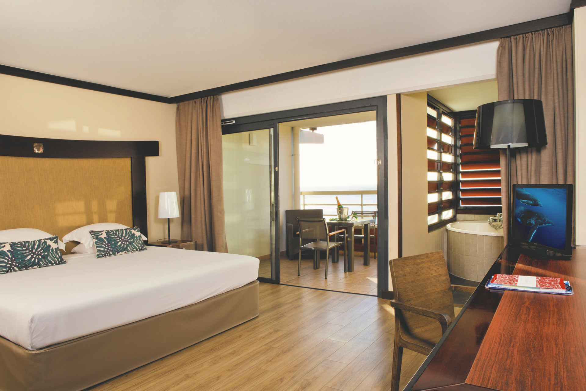 91 moderne, geräumige, klimatisierte Zimmer mit Balkon und uneingeschränktem Meerblick, einige mit Jacuzzi. Premium-Zimmer auf der obersten Etage. Badewanne ist Standard, die Suiten haben zusätzlich eine separate Dusche.Die Signature Unterkünfte im neuen Gebäude bieten modernen, zeitgemäßen Luxus. Balkone mit Blick auf die Matavai Bucht, Jacuzzi und luxuriöse Dusche statt Badewanne. Im Signature Gebäude gibt es auch Unterkünfte mit Küche.