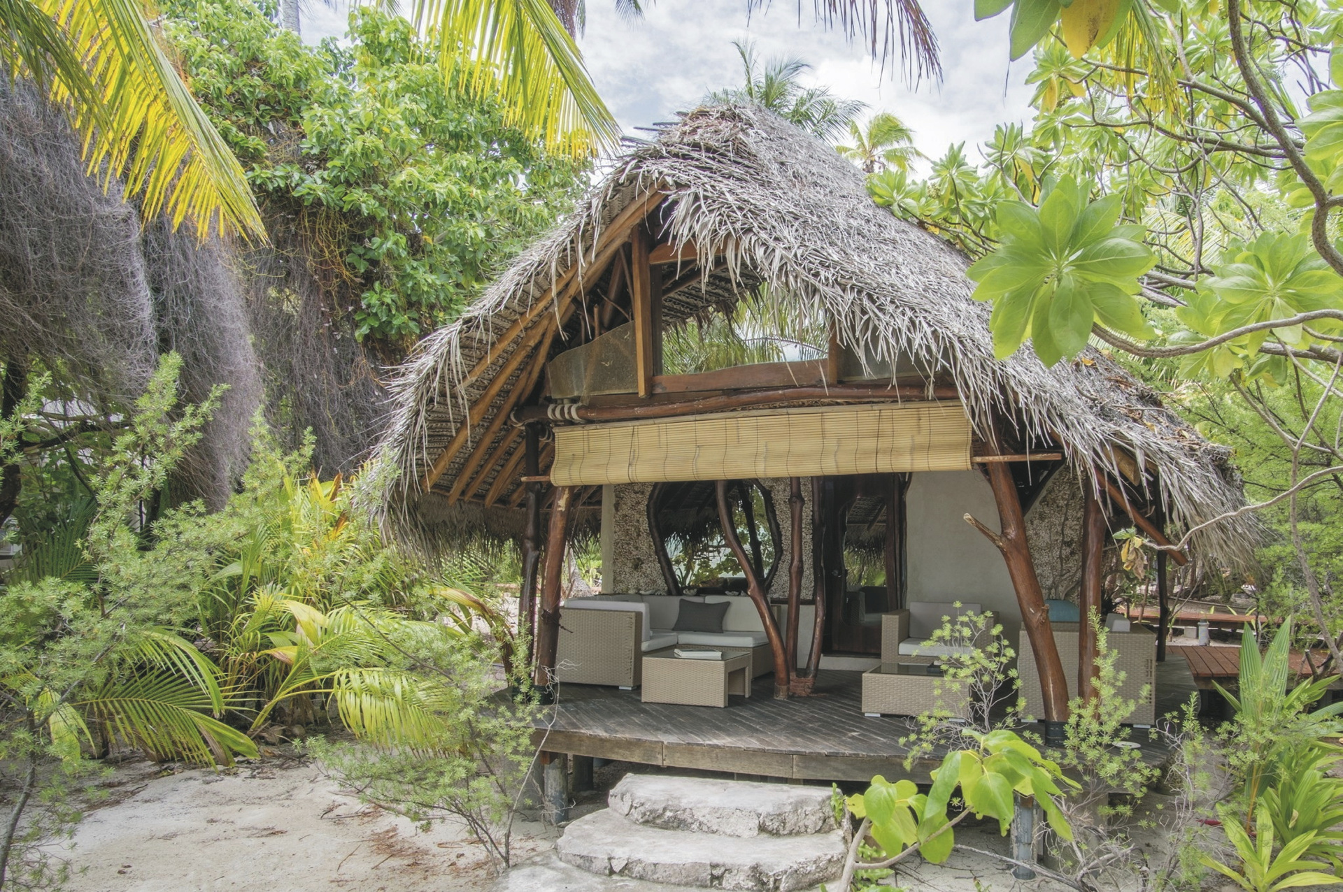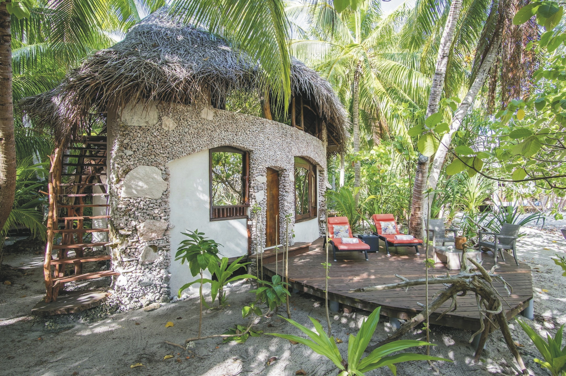 8 Bungalows im Garten oder am Meer aus natürlichen Materialien wie Korallen und Palmwedeln, ausgestattet mit Ventilator, MP3-Dock, Moskitonetz.
