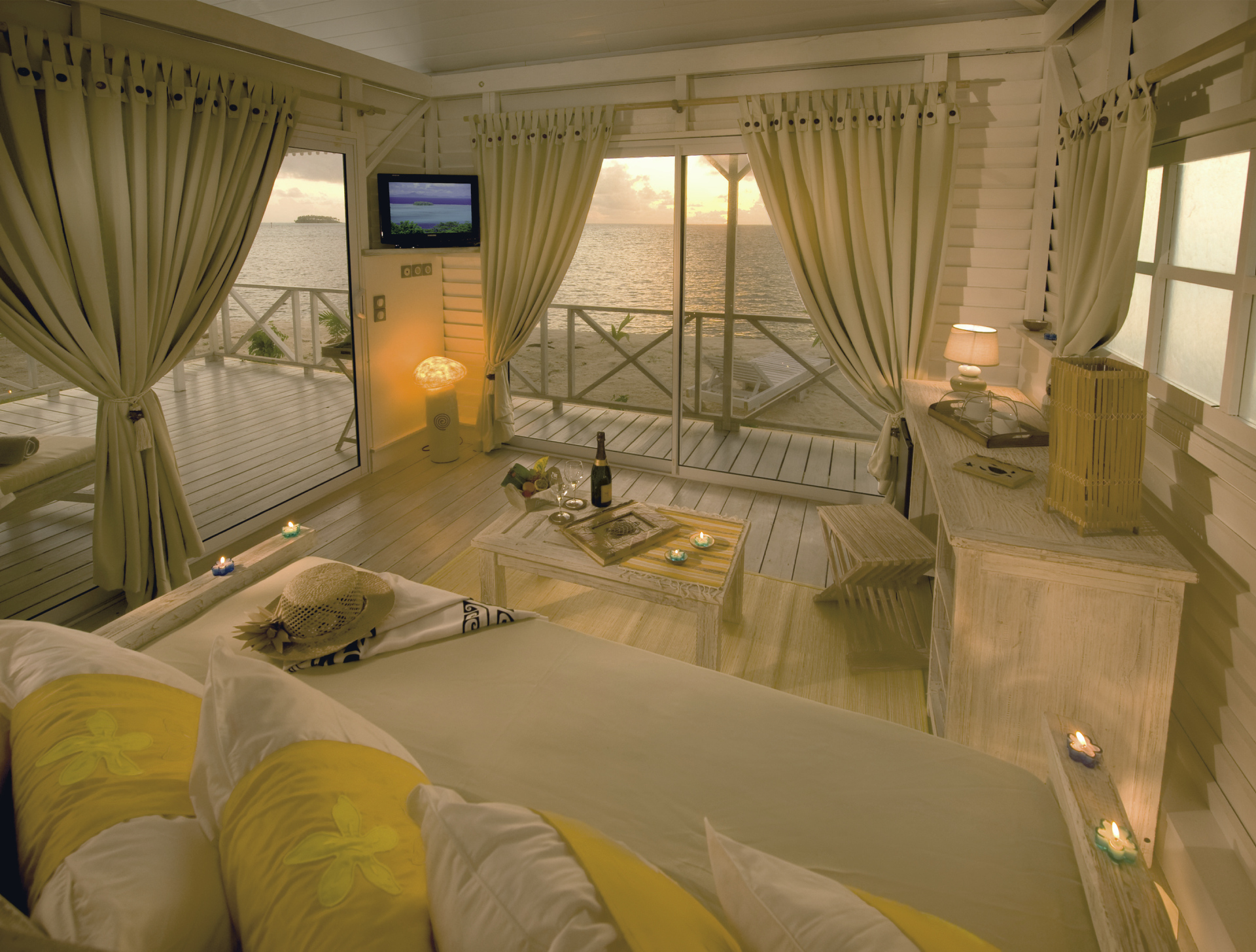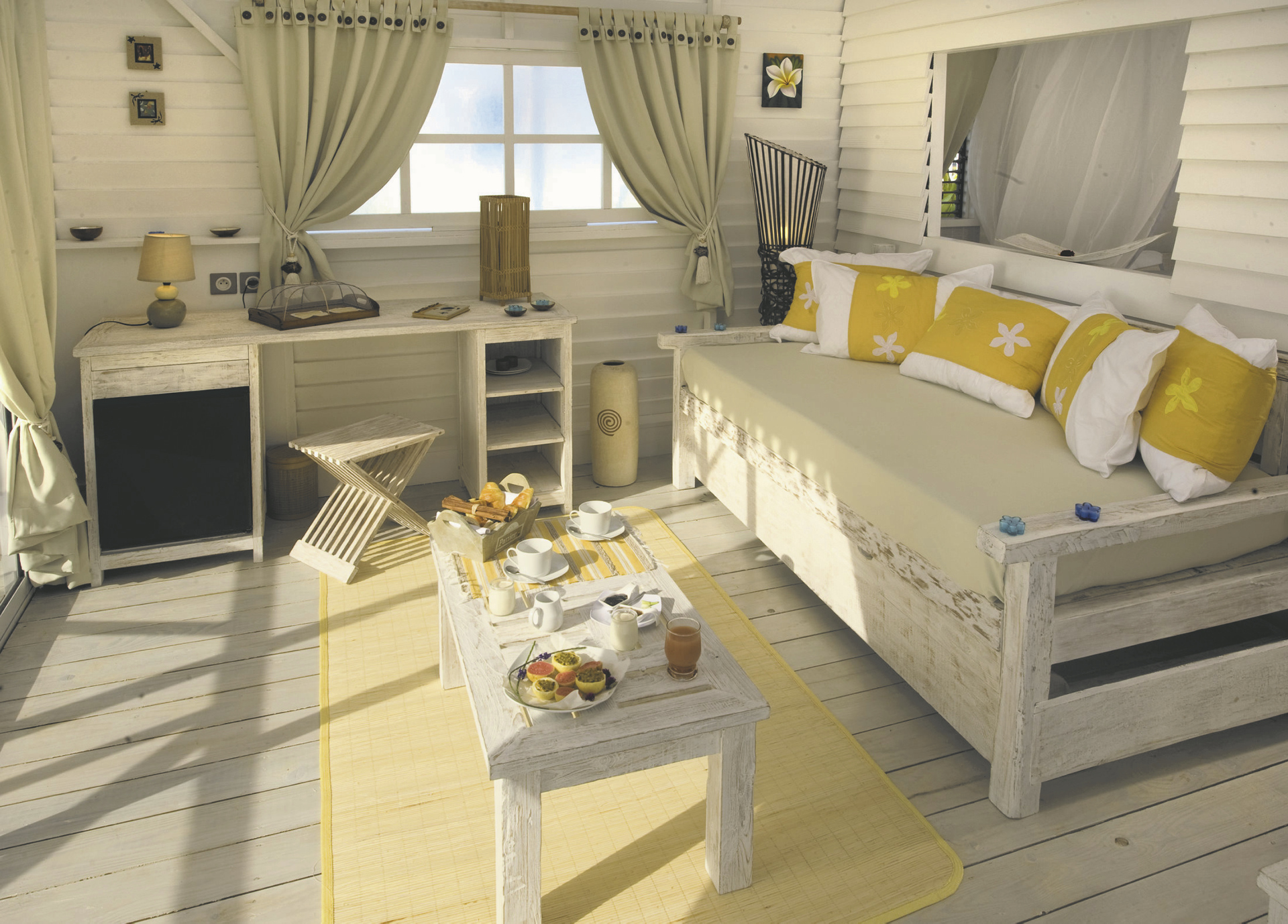 9 helle Bungalows, geschmackvoll eingerichtet mit Ventilator, Telefon, TV, WLAN kostenlos, Minibar, Tee-/Kaffeezubereiter, Fön, Terrasse mit Hängematte.