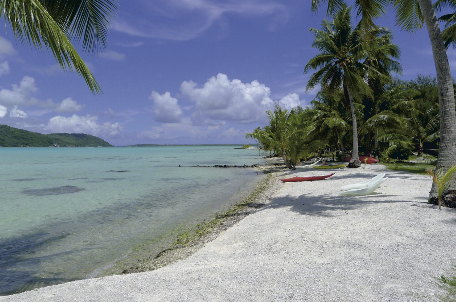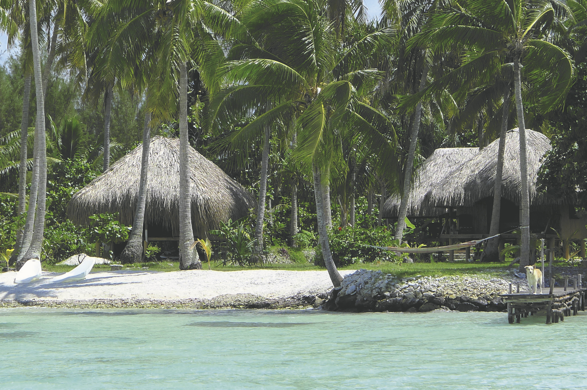 Traditionelle Bungalows auf einem Motu mit weißem Sandstrand.
