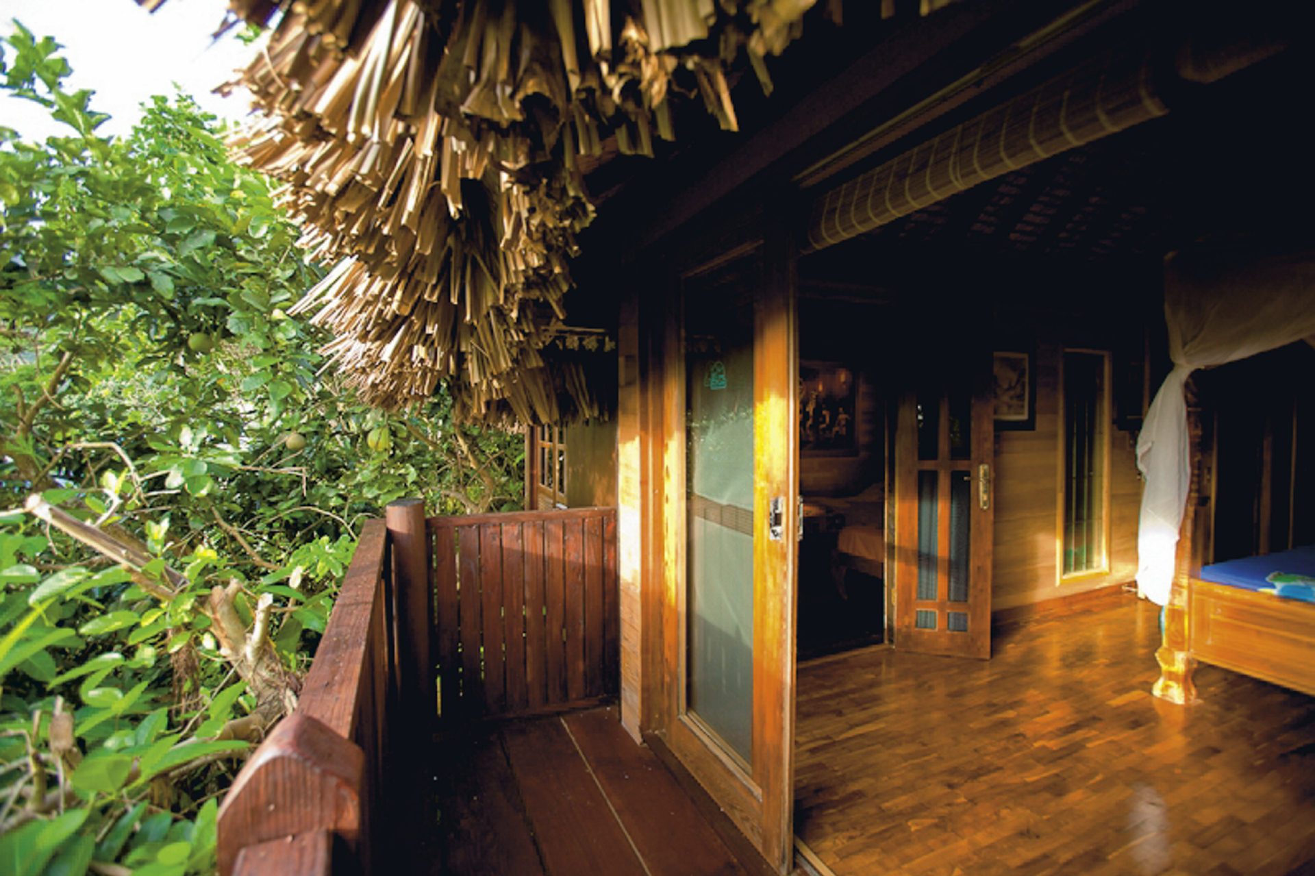 Geräumige, aus lokalem Holz gefertigte Bungalows mit Klimaanlage bieten ein großes, offenes Bad, Ventilator, Küchenzeile mit Kühlschrank, Mikrowelle, Tee-/Kaffeezubereiter, Moskitonetz, Safe und großzügige Veranda. Zusätzlich gibt es eine 2-Schlafzimmer-Villa im Garten.