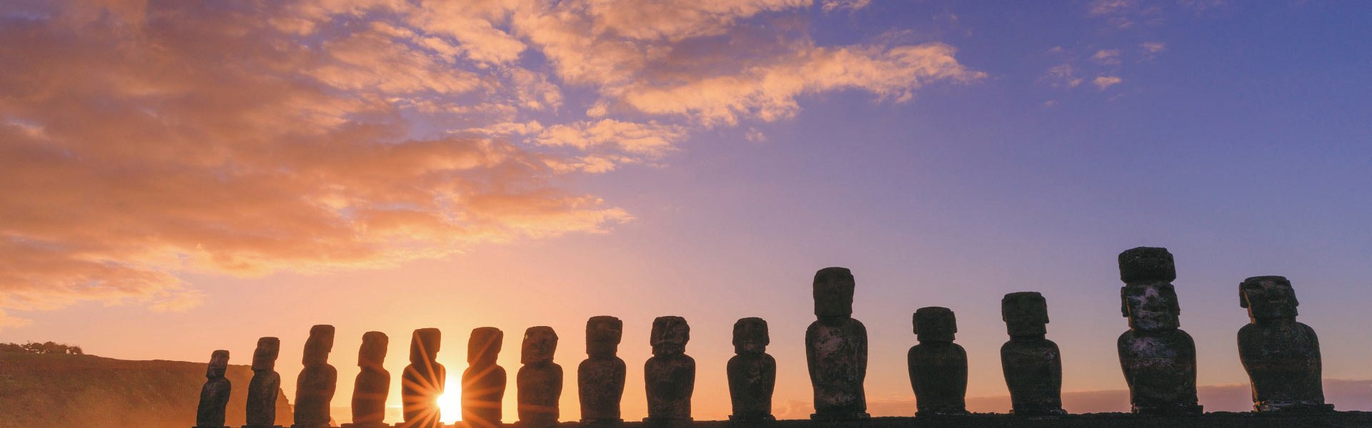 Die Osterinsel (162 km²), Rapa Nui, liegt einsam und isoliert mitten im Pazifik, jeweils rund 4.000 Kilmeter von Chile und Tahiti entfernt. Die Insel birgt immer noch viele Geheimnisse und ist übersät mit fast 1.000 riesigen Steinkolossen, den Moai.