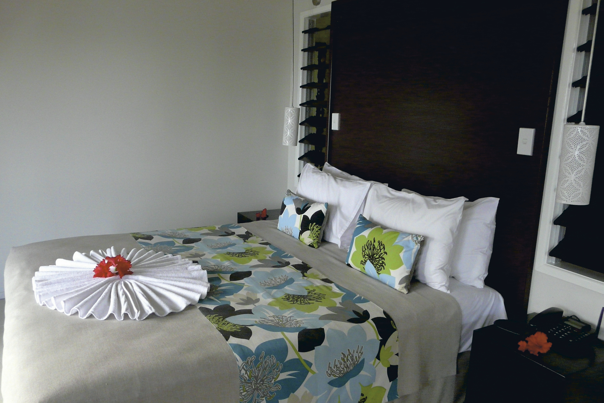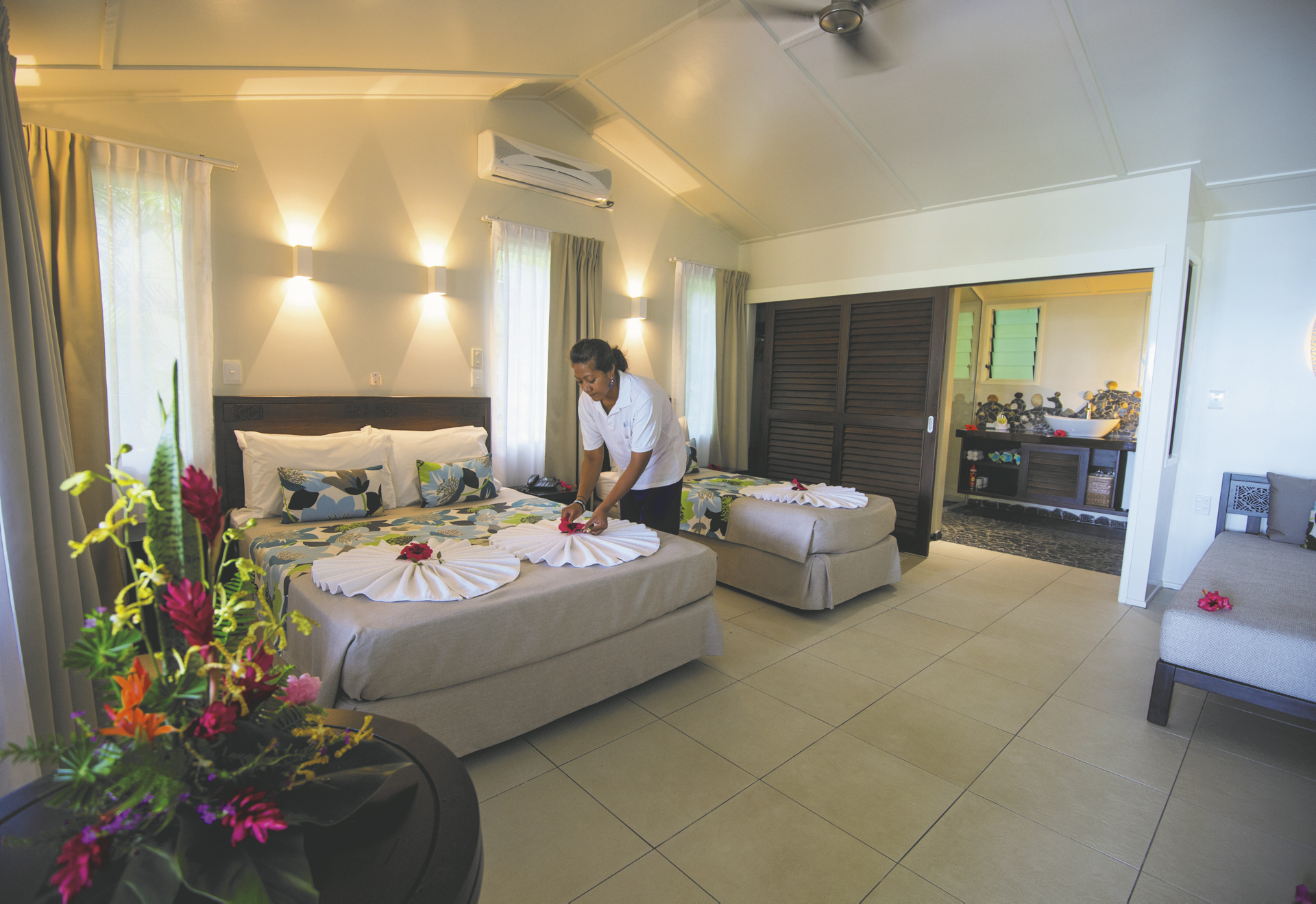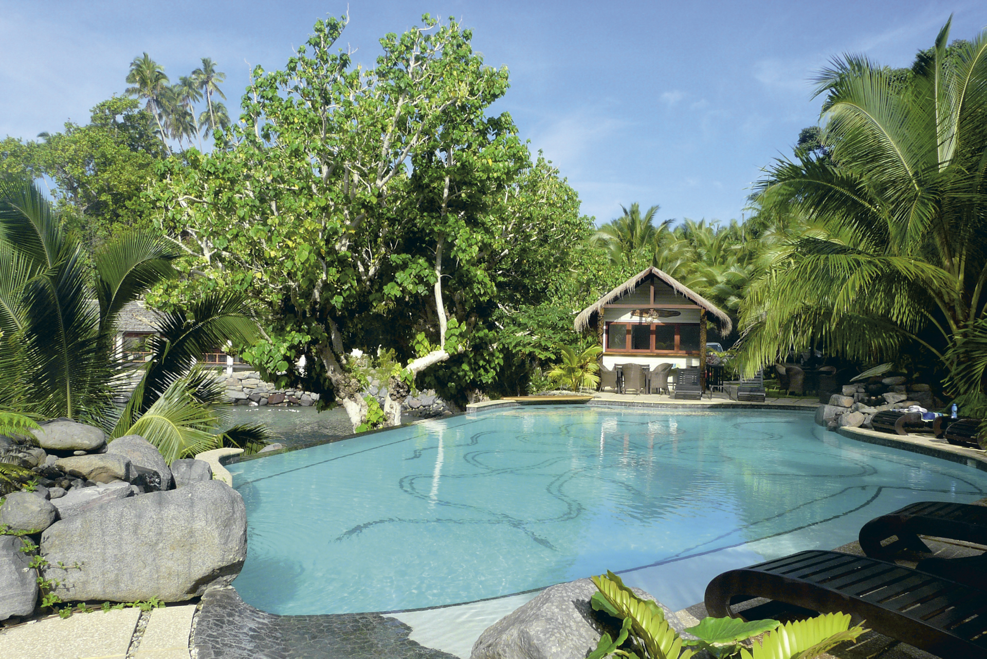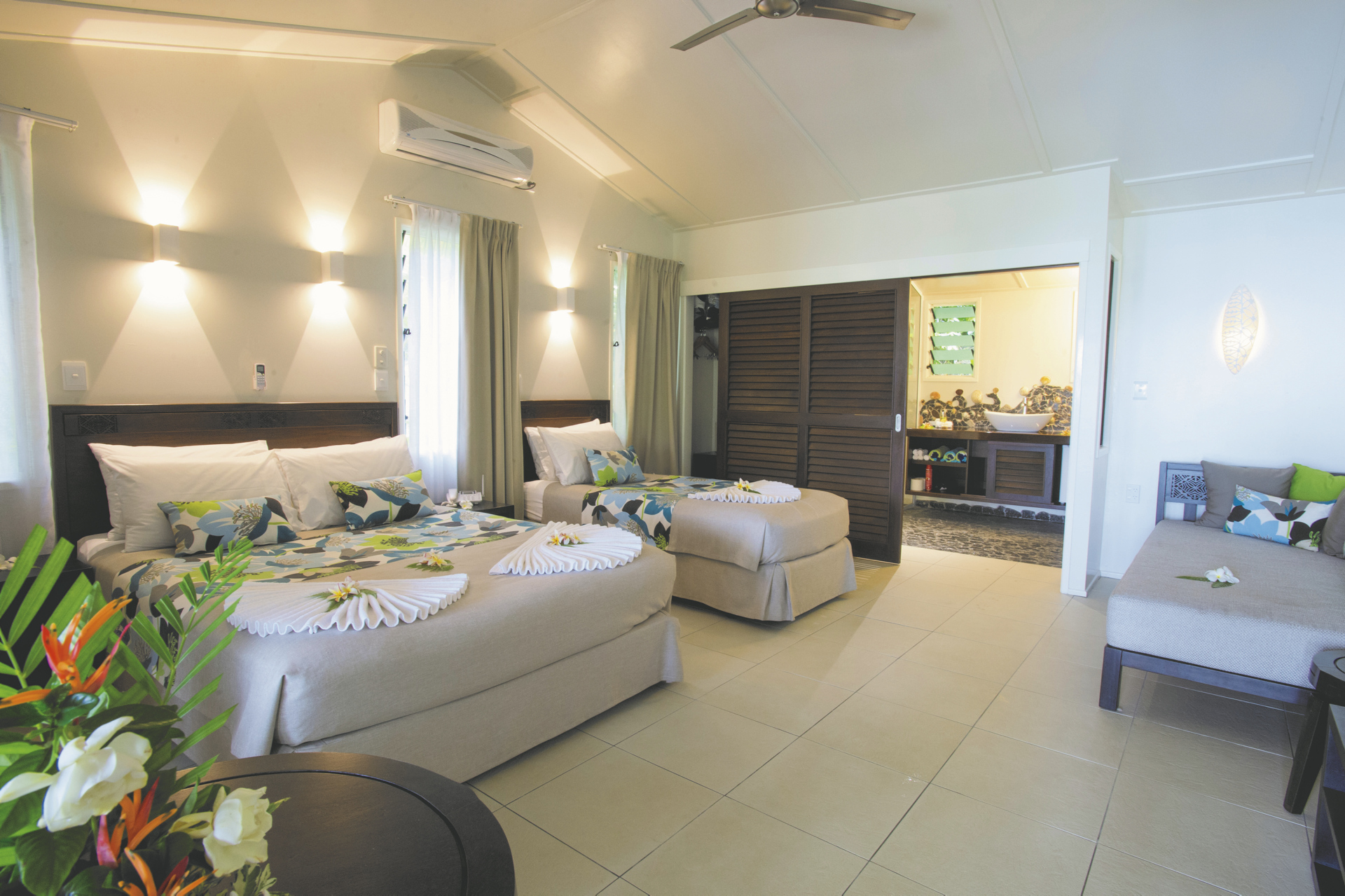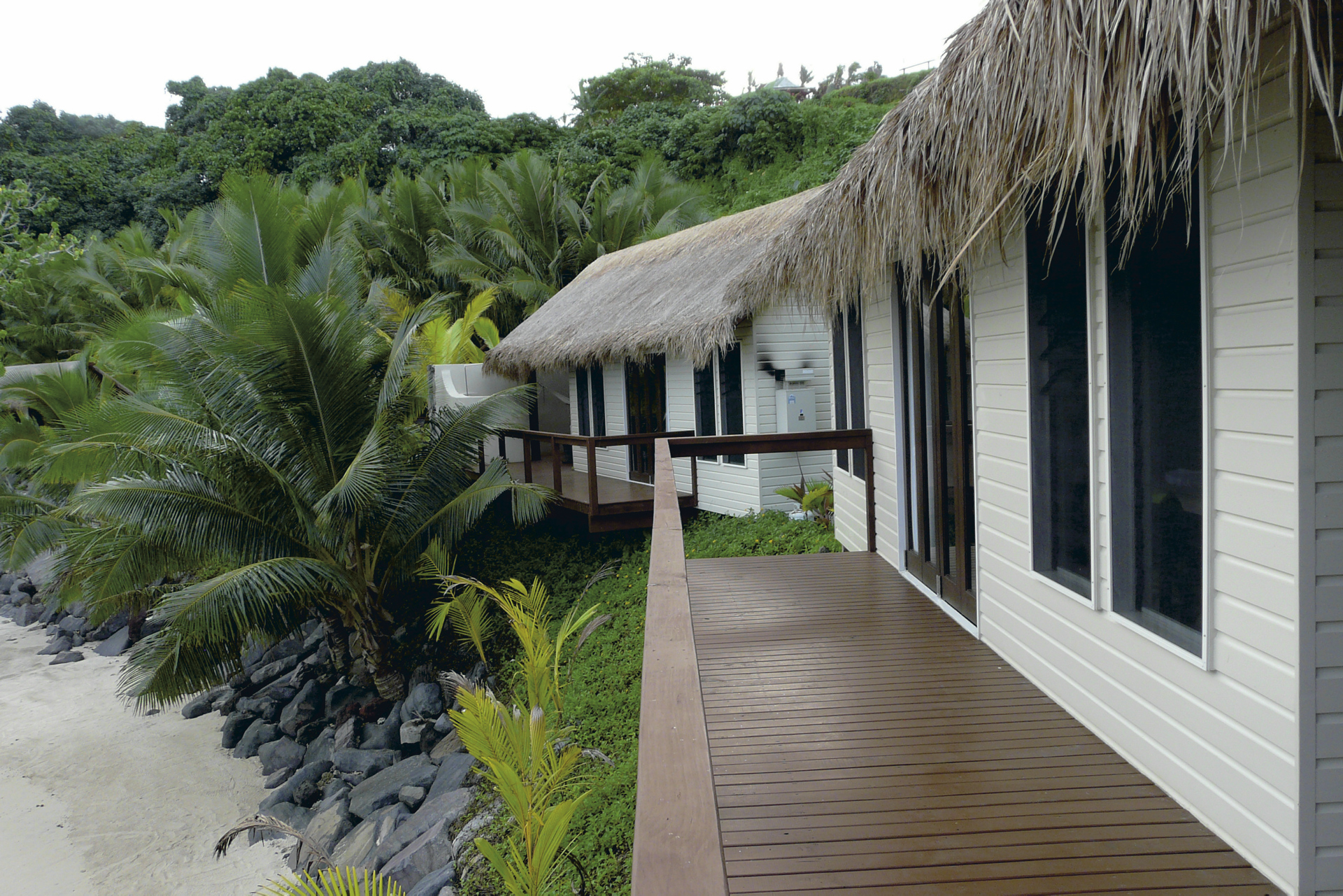 Polynesisch-moderne Villen mit großzügiger Terrasse, Hängematte, Lagune-/oder Meerblick, werden von der Meeresbrise gekühlt. Fliegengitter, Klimaanlage, Ventilator, Kühlschrank sind Standardausstattung. Die Suiten sind größer, Strandvillen haben Außendusche.
