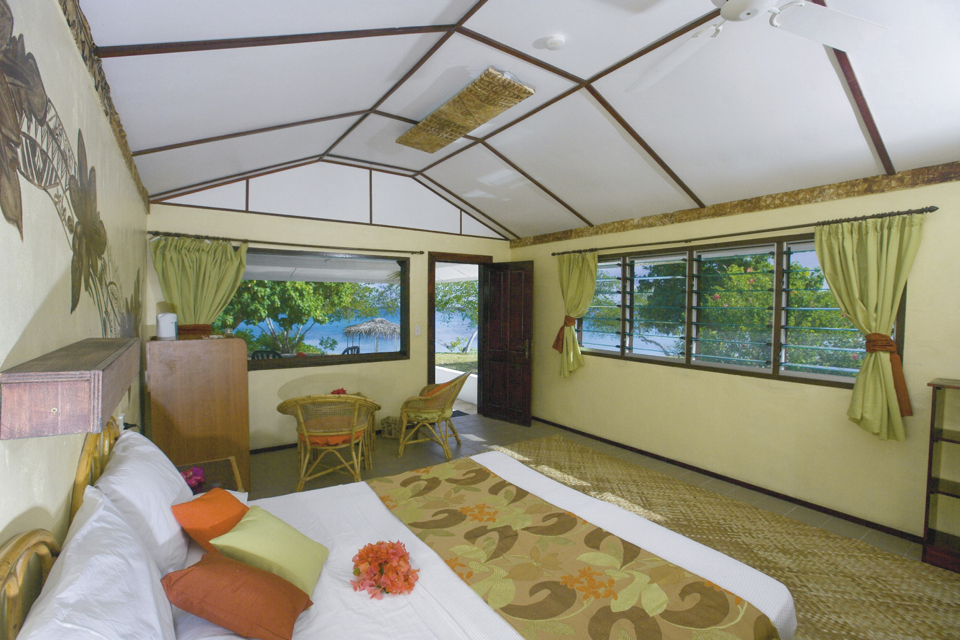 12 geräumige Fales mit Ventilator, Tee-/Kaffezubereiter und Kühlschrank sowie Terrasse mit Liegestühlen. Kein TV, kein motorisierter Wassersport. WLAN gratis.
