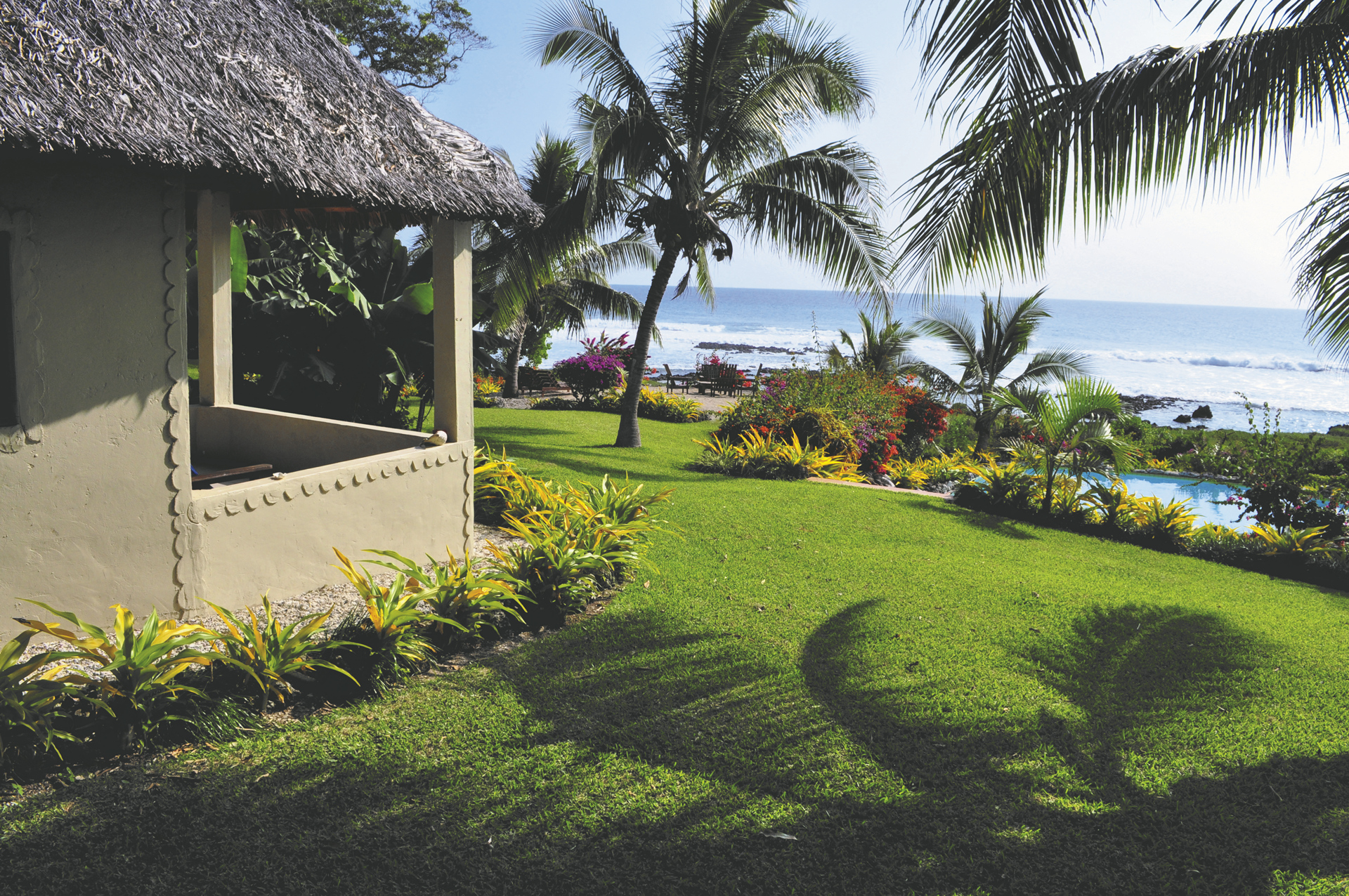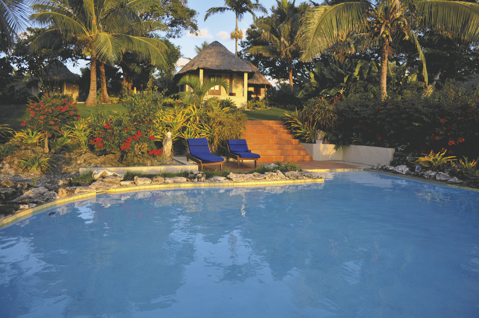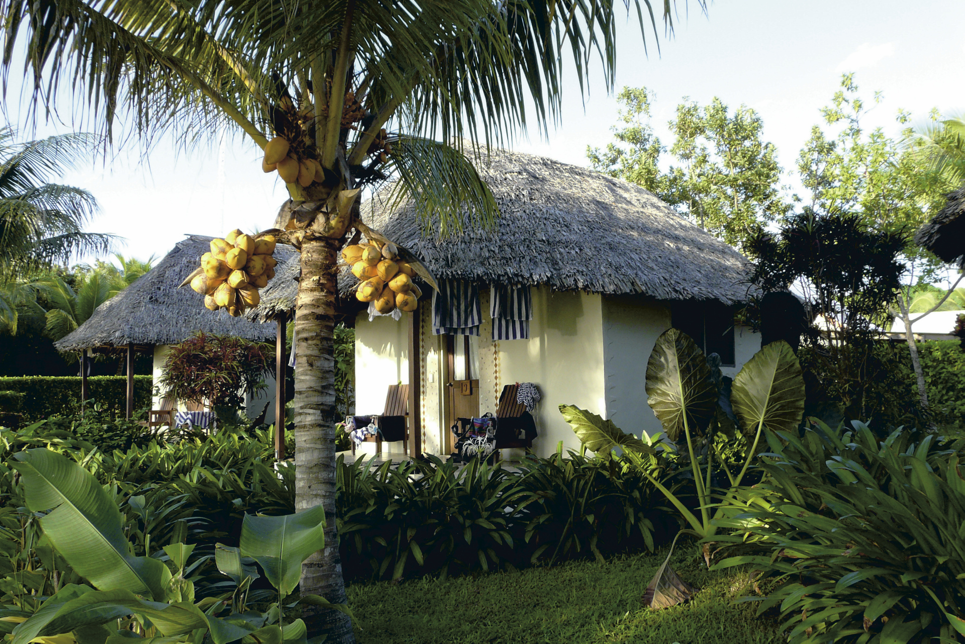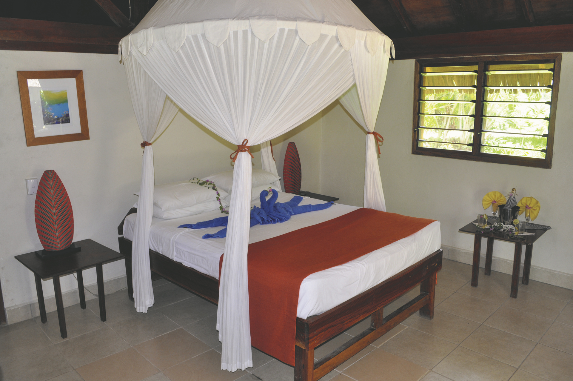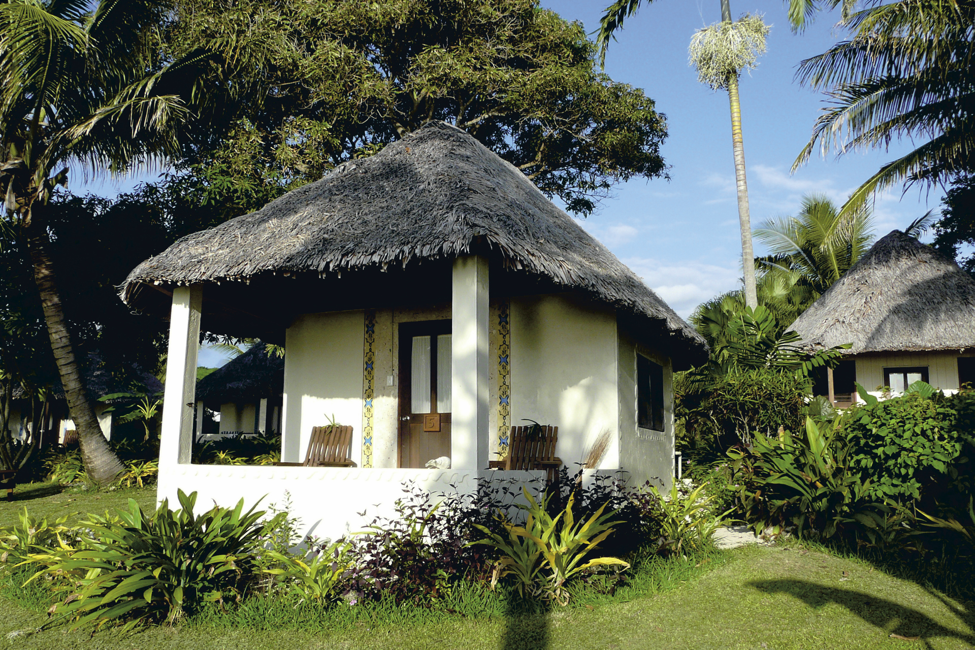 Die 14 Bungalows mit Terrasse sind zweckmäßig mit pazifischen Einflüssen, Ventilator, Tee-/Kaffeezubereiter, Minibar, Moskitonetz und privatem Bad mit Dusche/WC eingerichtet